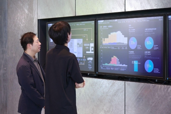 お伝えしたように、今回は多棟エネルギーマネジメントのイノベーションをいかに来訪された方たちに伝えるか、ということが目的です。実際の使い方としては、見学者が水素発電に関する設備などを見た後に、現在の発電量や今後の消費電力の様子、エネルギーを融通し合っている状況を、大きな三連モニターにMotionBoardの画面を表示してお見せしています。
